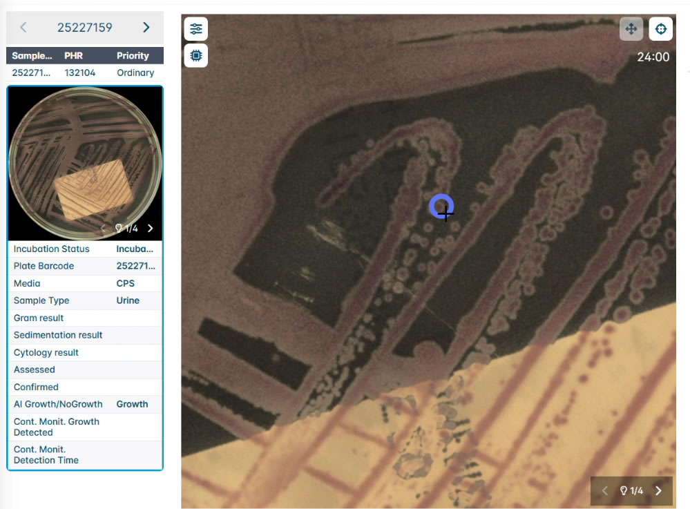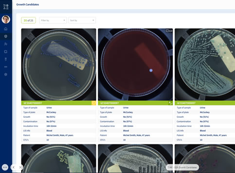 The intelligent incubation system is the only system on the market equipped with 2 complementary imaging systems. A first continuous monitoring system that allows uninterrupted monitoring of sample growth, being capable of generating alarms as soon as growth is detected in the sample. The second system captures the overhead image, digitising the sample and executing artificial intelligence algorithms to determine the characteristics of that growth. This advanced platform that combines time-based and growth-based management protocols, provides the laboratory with a unique tool to address emergency situations, to efficiently optimise workflow processes thus contributing to a more effective operation and accelerated results in the laboratory.